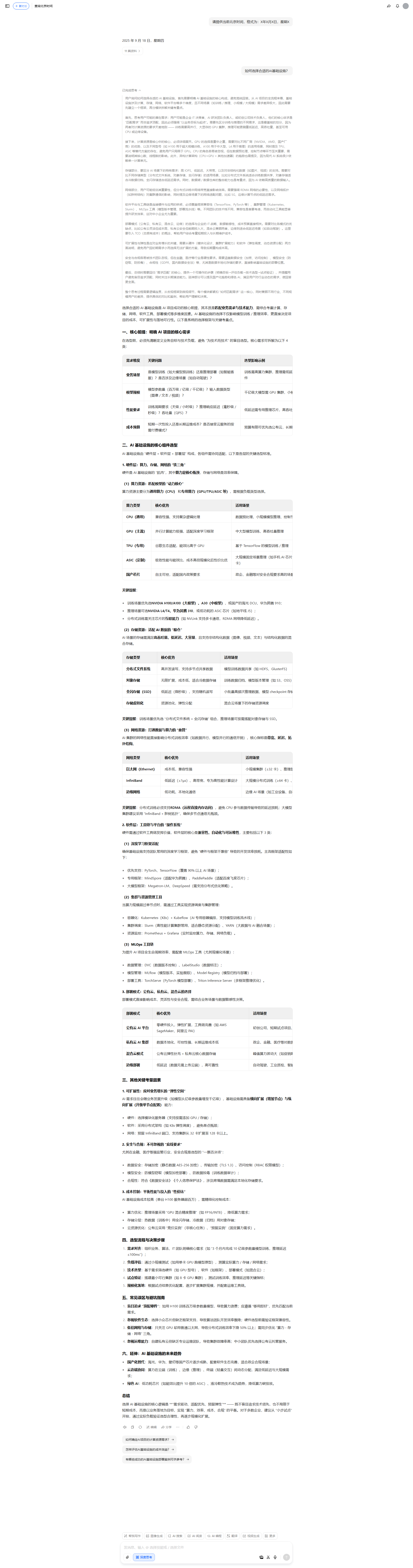 用户询问如何选择合适的AI基础设施,首先需要明确AI基础设施的核心构成,避免笼统回答。从AI项目的全流程来看,基础设施涉及计算、存储、网络、软件平台等多个维度,且不同场景(如训练/推理、小规模/大规模)需求差异极大,因此需要先建立一个框架,再分模块拆解关键考量点。