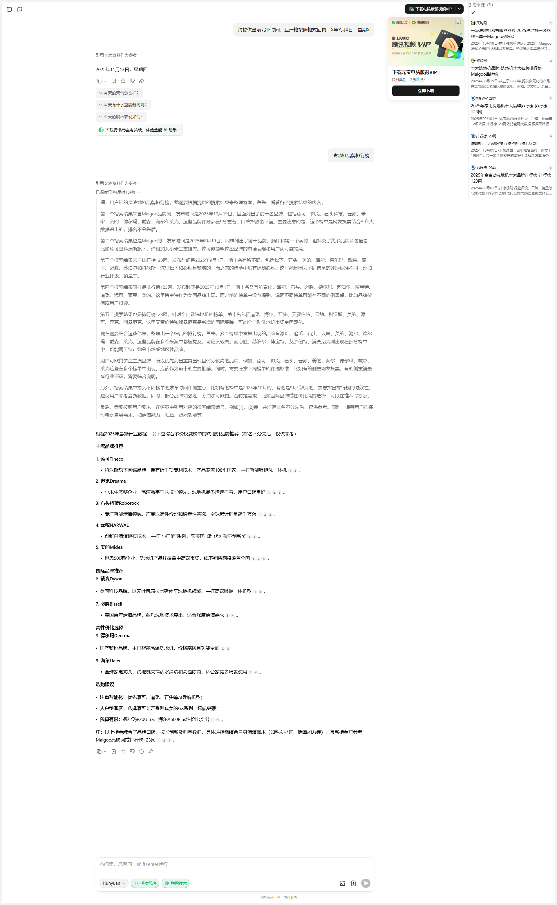 第一个搜索结果来自Maigoo品牌网,发布时间是2025年10月19日,里面列出了前十名品牌,包括添可、追觅、石头科技、云鲸、米家、美的、德尔玛、戴森、海尔和莱克。这些品牌评分都在9分左右,口碑指数也不错。需要注意的是,这个榜单是网友投票结合AI和大数据得出的,排名不分先后。