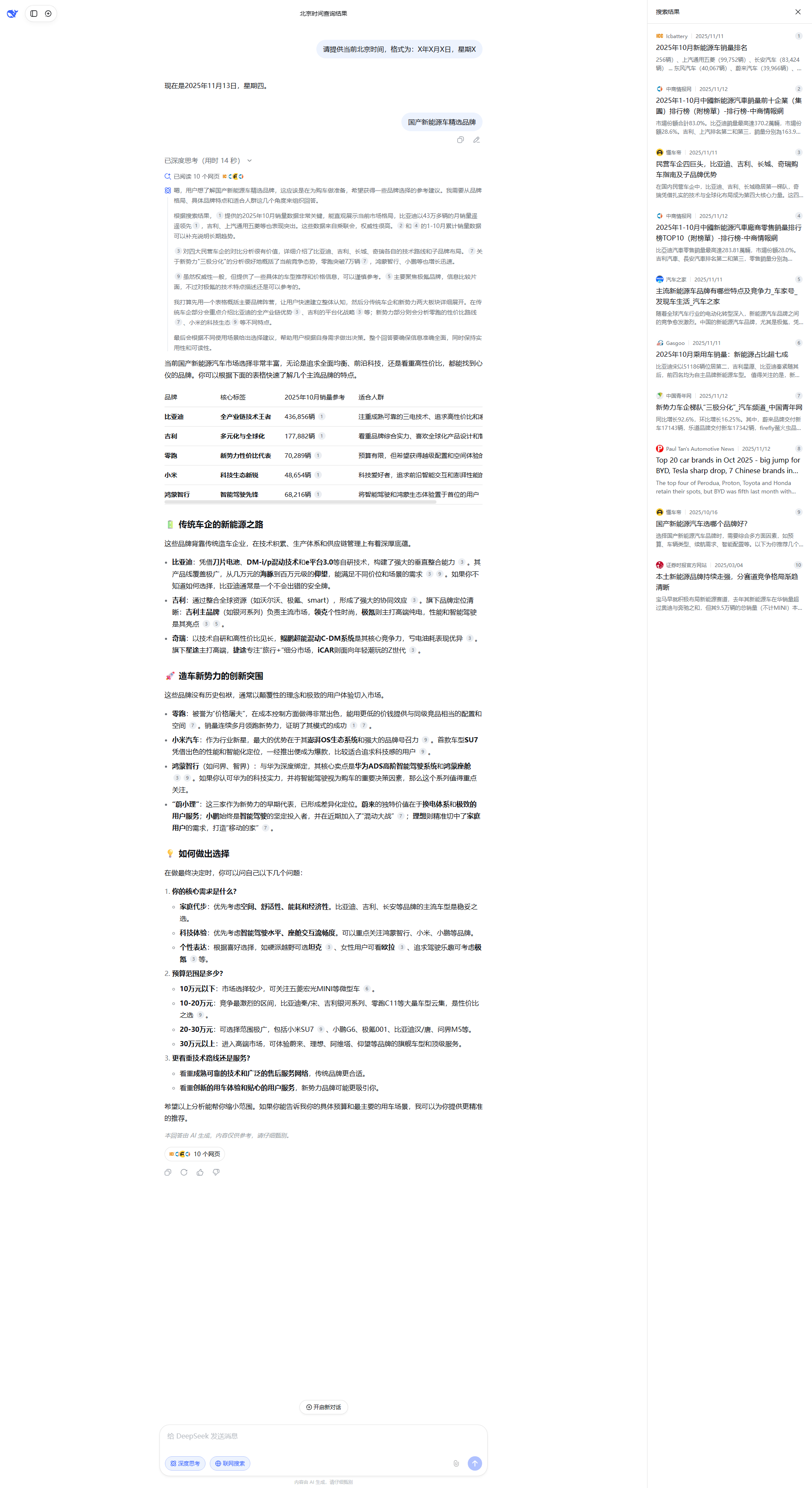 我打算先用一个表格概括主要品牌阵营,让用户快速建立整体认知,然后分传统车企和新势力两大板块详细展开。在传统车企部分会重点介绍比亚迪的全产业链优势[citation:3]、吉利的平台化战略[citation:3]等;新势力部分则会分析零跑的性价比路线[citation:7]、小米的科技生态[citation:9]等不同特点。