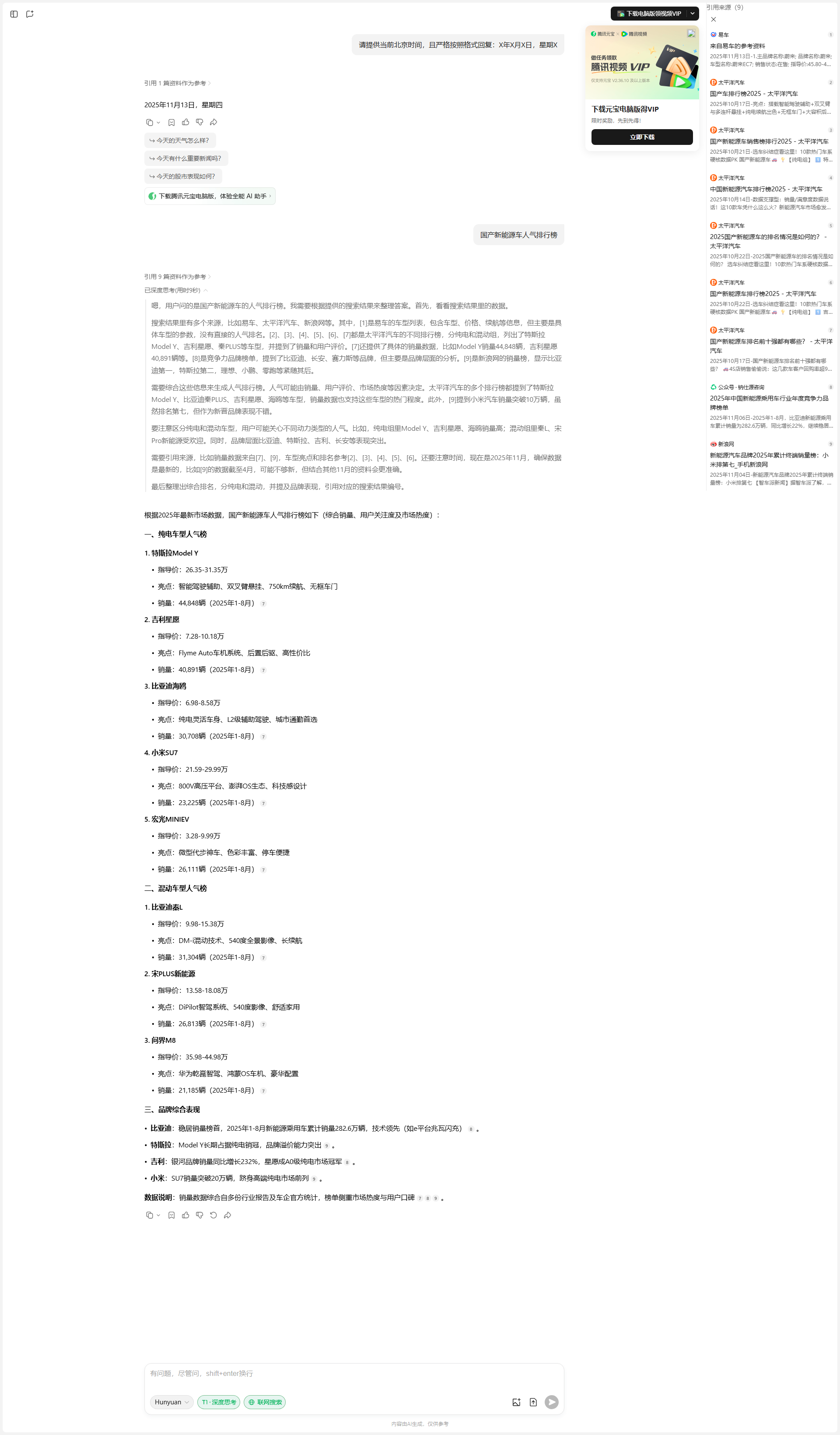 | https://www.toutiao.... | 在路上:国产排名前十的电车,deepseek给出合理分析,能给支持国产并考虑买车的你很好的参考! 根据2025年最新市场数据,国产纯电动汽车(电车)在销量、技术、用户体验等方面均表现出色。以下是综合销量、技术配置、用户口碑等因素整理的国产纯电汽车排名前十的车型,并附上详细分析: 1. 比亚迪汉EV - 指导价:20.98-33.18万 - 销量:2025年2月销量稳定在2万辆以上 - 特... |